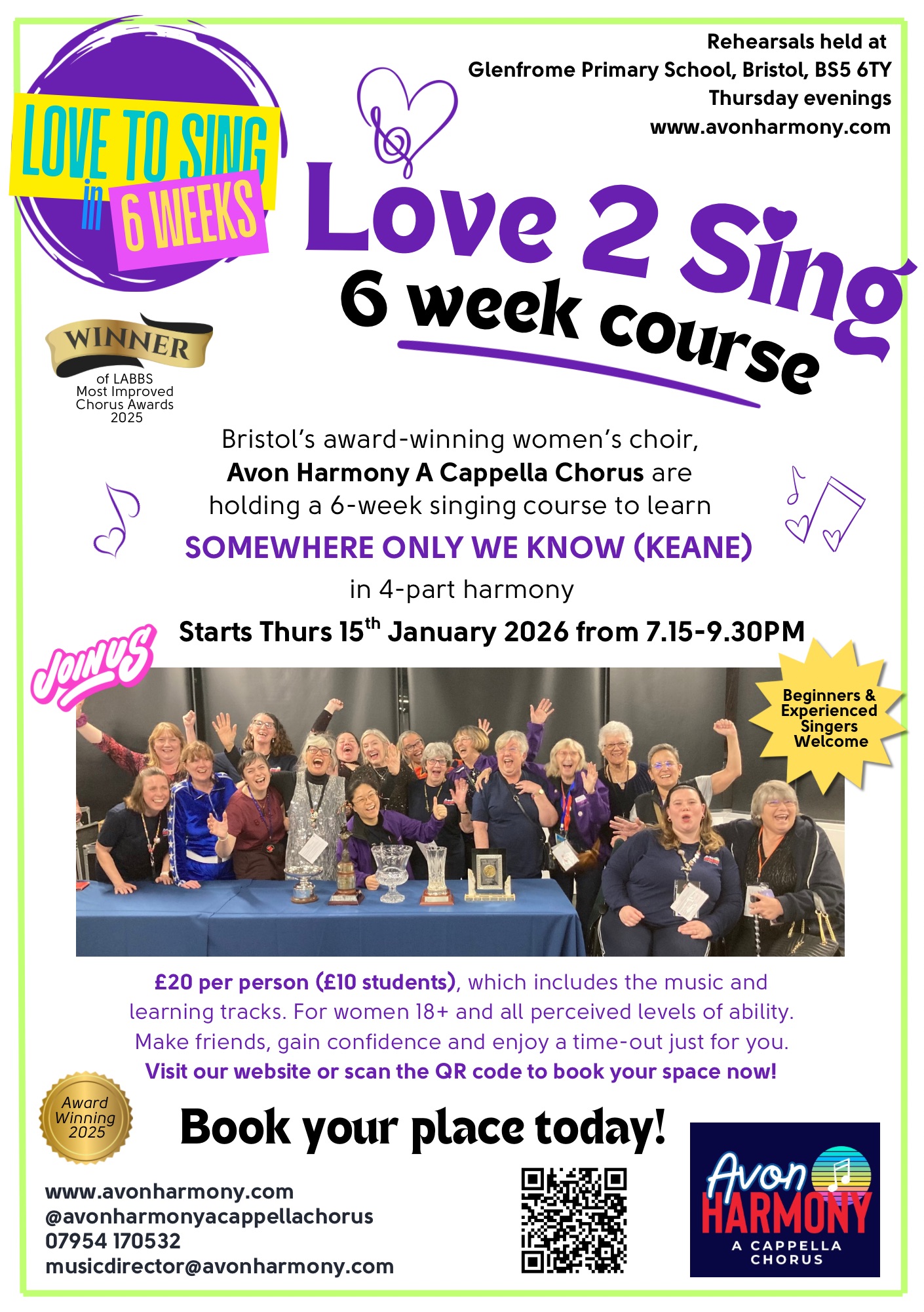 Avon Harmony A Cappella Choir are an award-winning bunch of diverse women from Bristol's Barbershop Chorus Scene. They enjoy singing barbershop and modern A Cappella, from Contemporary music, popular and show songs - to vintage-inspired music. We won five most improved awards & Trophies at the national LABBS singing Convention in October 25.